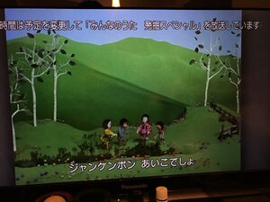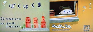 「陽光のなかの僕たち」の日傘をさした黒猫の絵の画面は総合テレビ、教育テレビでは2014年のリクエスト枠で使用されたなわとびを持って雲に座る子供の画面でした。